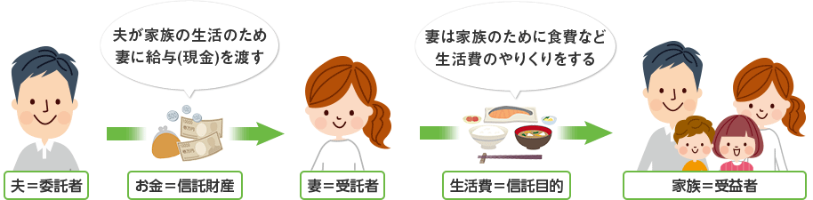 上の図では、夫が委託者になっており、「妻に、家族のために、現金を、生活の為に」託すこと決めています。 -