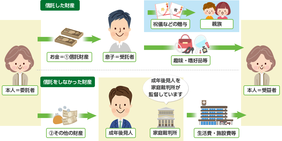 信託契約をすることで、成年後見人や裁判所が監督する財産から除かれますので、家庭裁判所の許可や同意は必要なく、また成年後見人の協力も必要ありません。