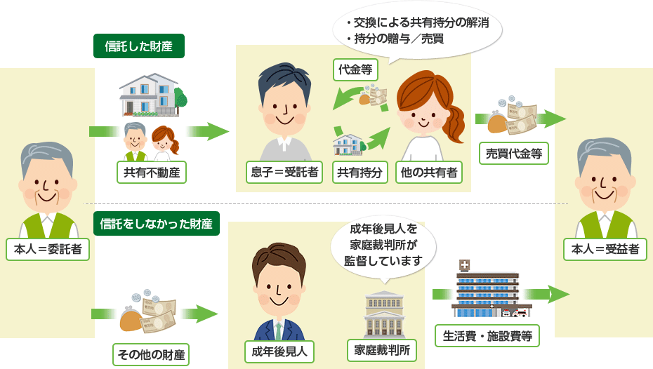 また、相続などで共有持分の解消などを目的として、親族間で不動産の贈与や交換などを計画していた場合でも、計画途中で判断能力が低下してしまった場合には、成年後見人が就いてしまって、裁判所の許可が得られず、計画の実現が叶わなくなってしまうこともありますが、これらの計画を事前に信託契約で取り決めをしていれば、成年後見人や家庭裁判所の制約を受けずに、あらかじめ指定しておいた金額や計画通りに不動産の処理をすることも可能となります。