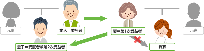 下の例では、信託契約で、息子が受託者として遺産を管理してもらい、妻がその財産を使って生活をします。その後、妻が死亡したときは、本来であれば相続で再婚相手の妻の子が引き継ぐことになりますが、信託契約で「残った財産は息子が引き継ぐ」ことを決めておけば、妻の子が相続するのではなくて、ご本人の息子が引き継ぐことができるようになります。この仕組みは、再婚相手はもちろんですが、パートナーとの関係が、事実婚の場合や、同性婚のような法律上相続権がない場合でも、利用することが可能です。