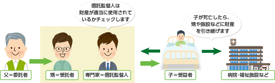 遺言や生前贈与では一括して財産を引き継がせる方法しかありませんが、自分が先だった後、親族が遺産を管理し、病気や障がいのある子の生活費(入院費)のために使い、その子が他界したときには、親族が残った財産を引き継ぐように指定することができます。