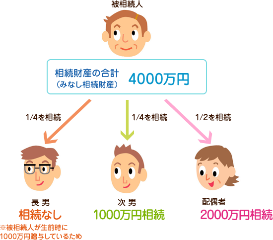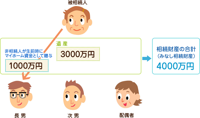 具体的には相続される人(被相続人)には、奥さんと、長男と次男がいるとします。長男にのみ、生きている間に、マイホーム資金として1000万円を贈与していて、次男には、贈与はなかったとします。そして、遺産が、3000万円だった場合、3000万円に1000万円を足した、4000万円を分割する相続財産として、遺産分割します。