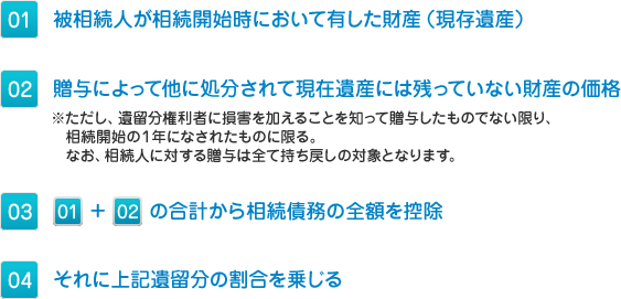 02.特別の働きをした相続人は、「遺産」の法定相続分にあらかじめ引いておいた評価額(寄与分)を加えた分が相続分となります。